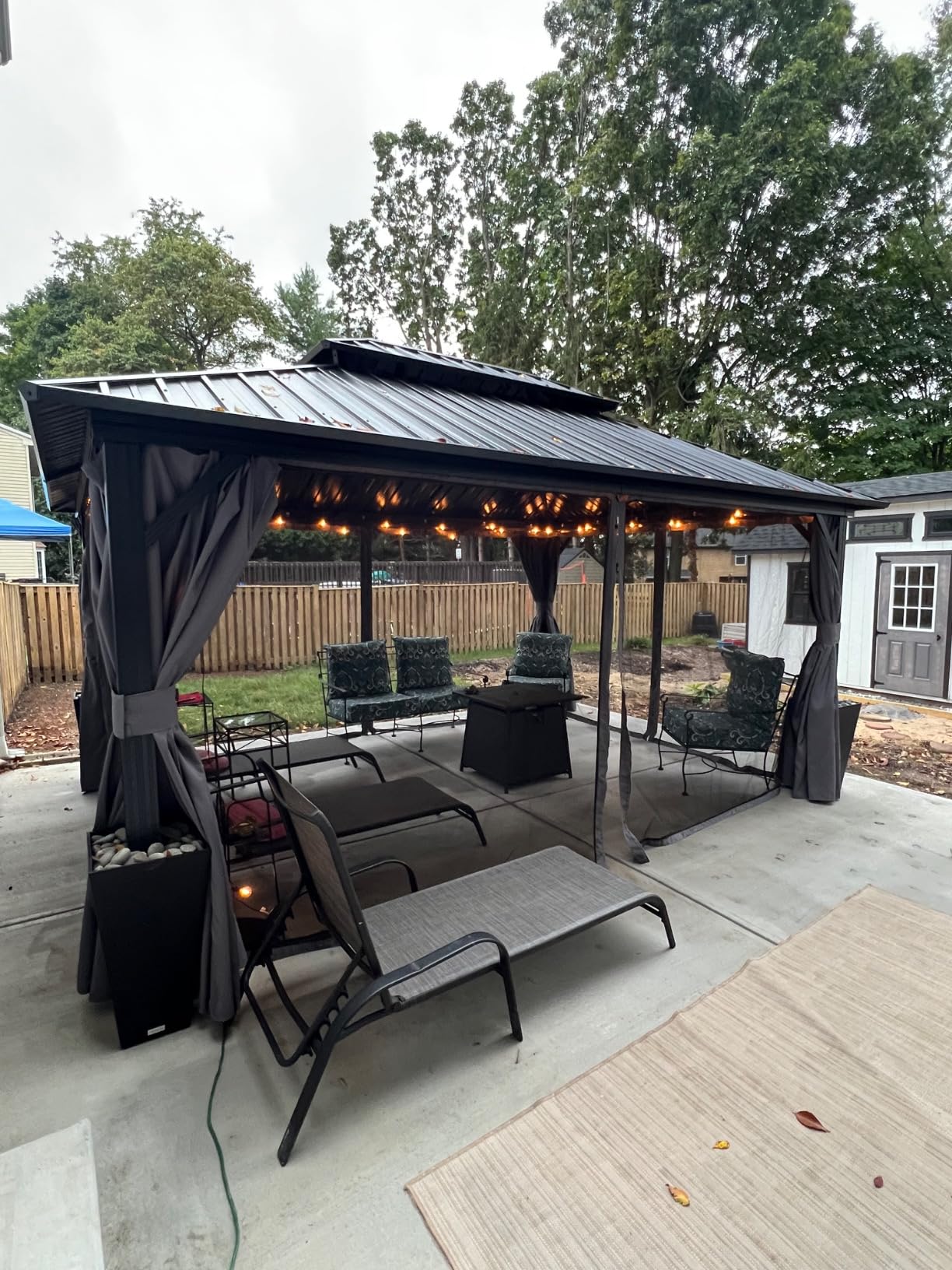 This gazebo is just amazing!I was looking at one at Costco but I wanted one a little larger than that one. This one was the size I was looking for with FREE SHIPPING. That is huge because these things come in multiple heavy boxes. I highly suggest you help the delivery person if you can!Let’s talk build. My husband and my son did it over the course of two days. Not the whole day, a few hours of each day. Also, we did not want to anchor this to our brand new concrete patio so we used tall planters filled with stones. They are not going ANYWHERE!For whatever reason I am a MOSQUITOS DREAM. Whenever I am outside, they attack me, I can NEVER enjoy spending time outside.UNTIL NOW!I love this space! The mosquito netting keeps me safe and allows me to spend time outside enjoying the weather. And enjoy it I do! I even like to go out in the rain. I love the sound of the rain on the metal roof and there have been ZERO LEAKS! It’s a perfect place to snuggle up with a blanket and a good book.My husband added a TV on a TV cart and now he can enjoy watching football outdoors.We haven’t had a party yet but we hope to have some friends over soon to break in the new space officially!If you are on the fence about getting one of these, DO IT!