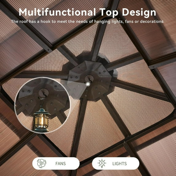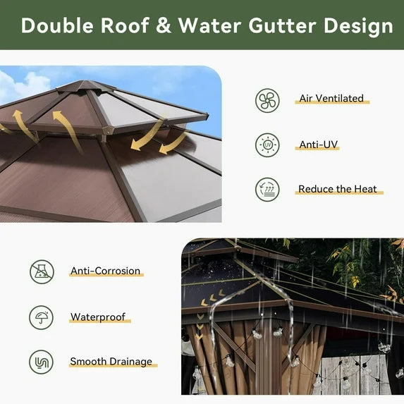 Dual-Layer Roof: Designed with polycarbonate double-layer top, the patio gazebo can help provide excellent airflow while preventing harmful UV rays. Besides, the sloped roof allows rainwater to slide right off and no worries for rainwater accumulation. Additionally, the black insect net on the top can further help keep the annoying insects out