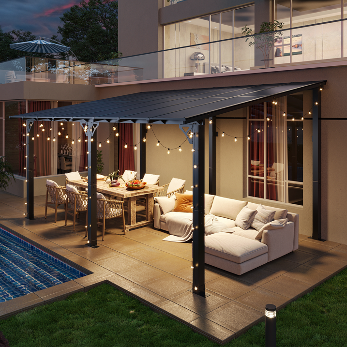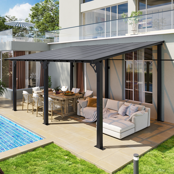 Get ready to transform your garden, patio, or backyard into a luxurious outdoor oasis with the AOXUN 10' x 20' Hardtop Gazebo. This sleek aluminum pergola in classic black is the perfect spot to relax, entertain, or simply escape the hustle and bustle of everyday life. Say goodbye to unexpected weather ruining your outdoor plans. The sturdy hardtop roof keeps you cool and dry, whether it's blazing hot or pouring rain. It's like having an instant outdoor room, perfect for lounging, dining, or just enjoying the fresh air. With its spacious 10' x 20' footprint, this gazebo is large enough to accommodate all your outdoor furniture and still have room to spare. It's the perfect size for intimate gatherings with friends and family, or just a quiet spot to unwind after a long day. But don't let its sleek design fool you – this gazebo is built to last. The aluminum frame is lightweight yet incredibly strong, making it easy to set up and maintain. Plus, it's rust-resistant, so you can enjoy your outdoor sanctuary for years to come without worrying about wear and tear. Please note: This is a wall-mounted lean to gazebo. It needs to be installed against a wall. For maximum stability, you can use the provided nails to secure the gazebo to the wall. As long as it is firmly anchored to both the wall and the ground, it will easily withstand heavy snow and harsh weather without any concerns.
