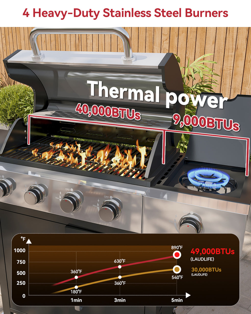 Aoxun 4-Burner Propane Gas BBQ Grill with Side Burner, 49000 BTU, Stainless Steel Outdoor Grill with Cast Iron Grates & Side Tables for Backyard, Patio, Camping