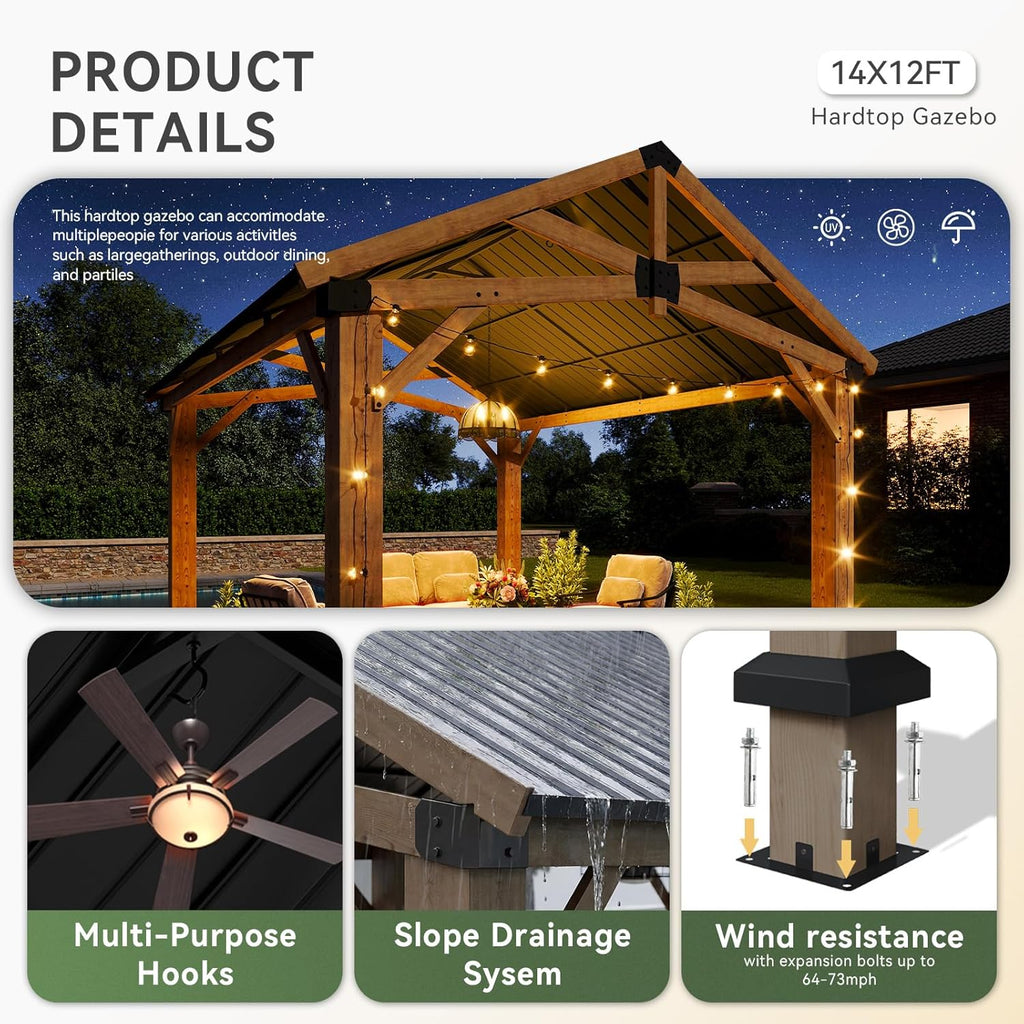 Our wood gazebo is designed with 15 inches snow loading depth and Max 73 mph wind resistance after installing expansion bolts, which further ensures overall stability.