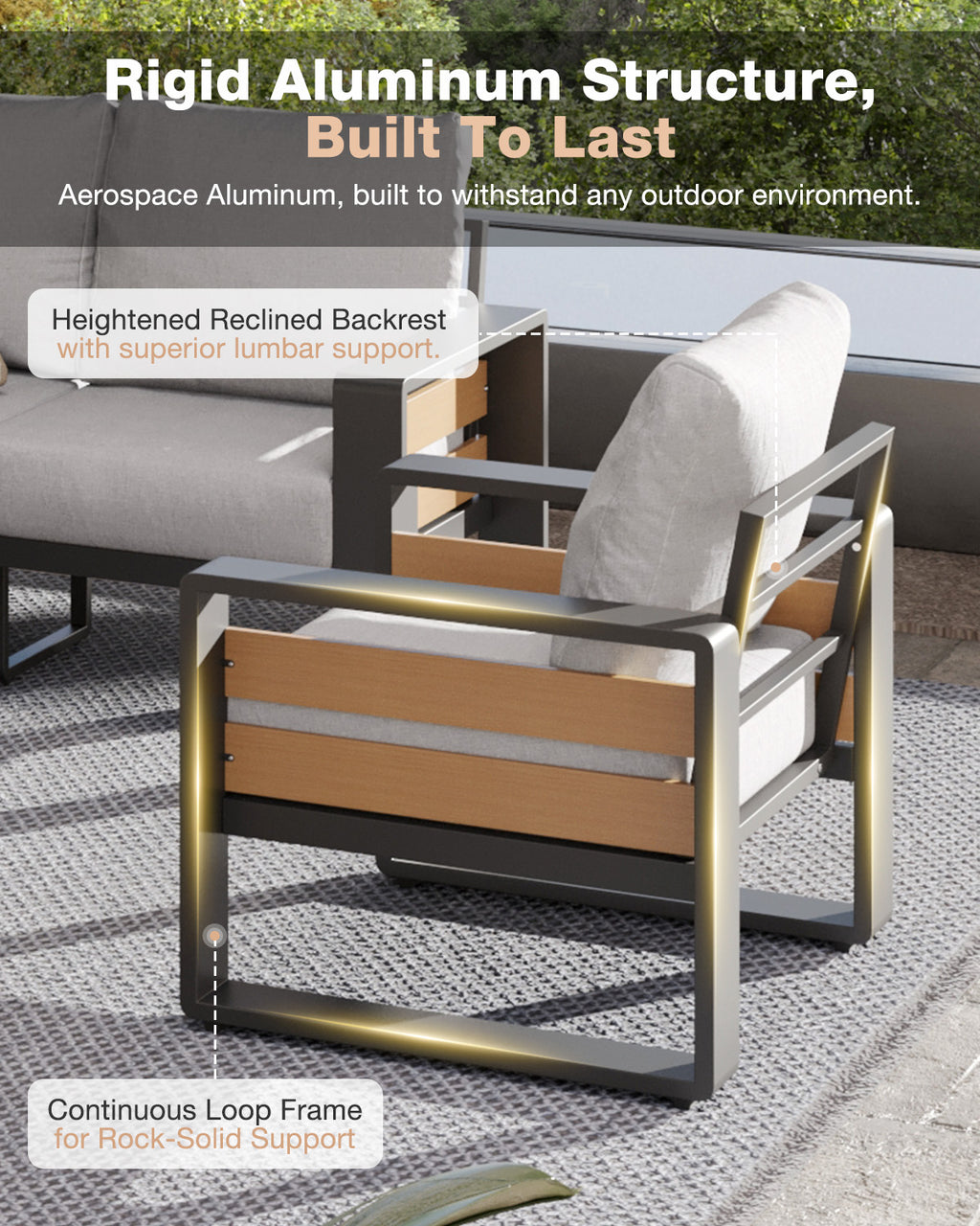 【Upgraded Oversized & Rugged Design】Featuring extra-wide 26" seats—far roomier than standard patio outdoor furniture—this patio set lets you stretch out and relax freely. The 3mm-thick aluminum frame provides outstanding strength while staying rust-proof and crack-resistant. Its Continuous Loop Frame improves stability, distributes weight evenly, and reduces wobbling.
