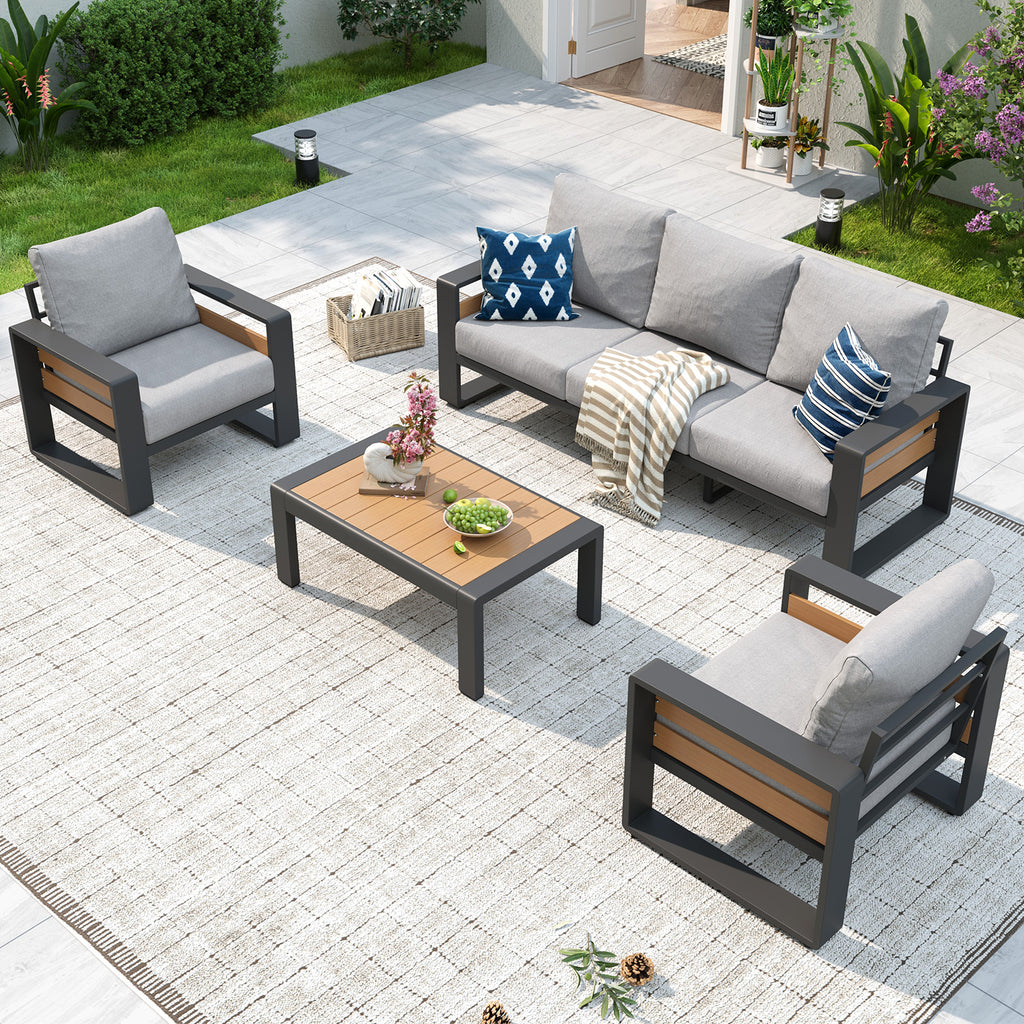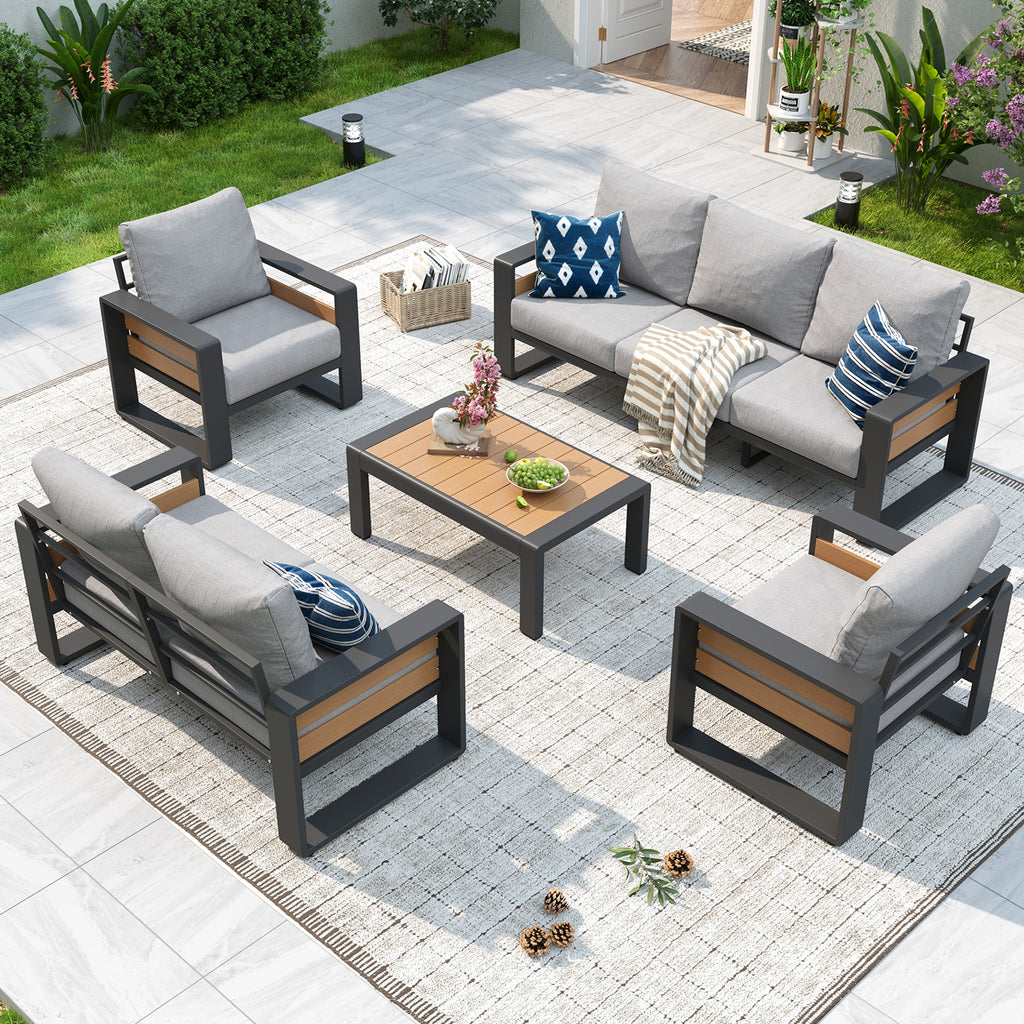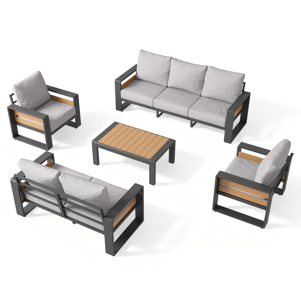 【Ergonomic Outdoor Seating with Luxury Cushions】The 6" Ultra-thick Cushions with double-layer 28D Foam offer plush, non-sag seating far beyond typical outdoor furniture. The wave-contoured back cushions enhance pressure relief, while the 105° Ergonomic Backrest and 3.6" Widened Armrests provide balanced, all-day comfort for our Outdoor Aluminum Sofa Set.