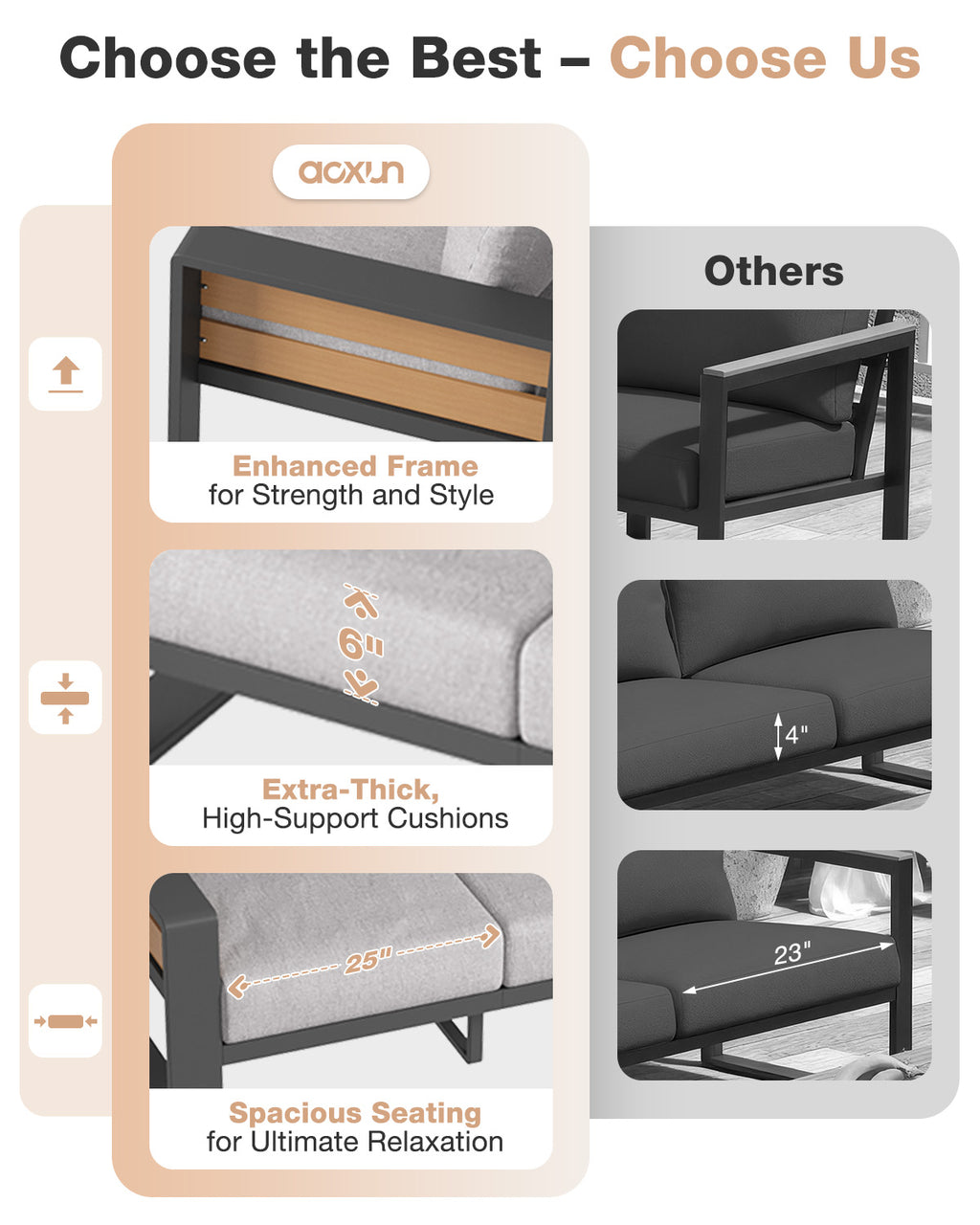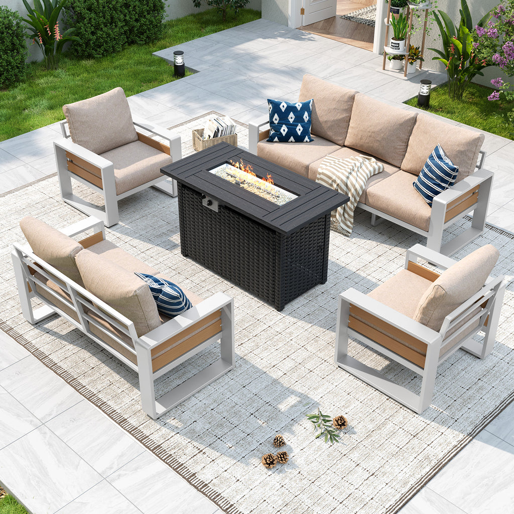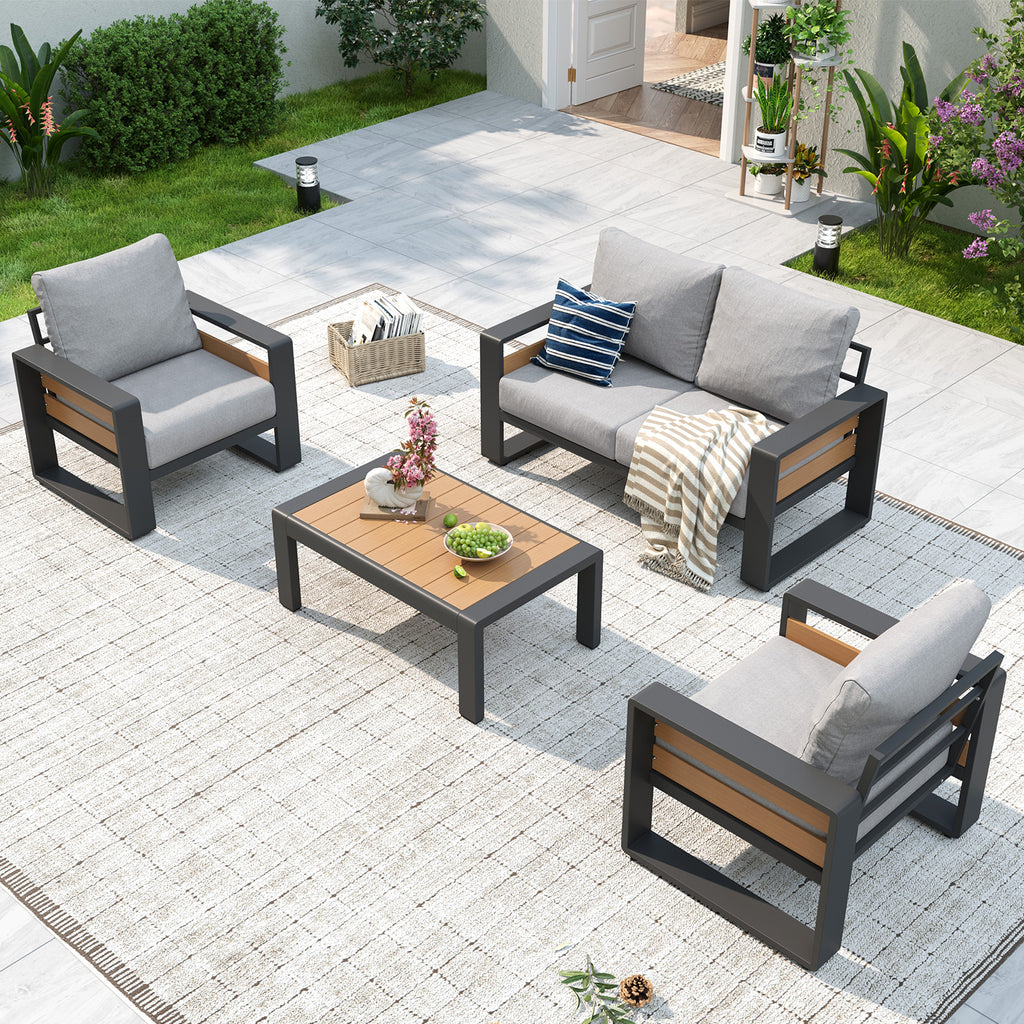 【Ergonomic Outdoor Seating with Luxury Cushions】The 6" Ultra-thick Cushions with double-layer 28D Foam offer plush, non-sag seating far beyond typical outdoor furniture. The wave-contoured back cushions enhance pressure relief, while the 105° Ergonomic Backrest and 3.6" Widened Armrests provide balanced, all-day comfort for our Outdoor Aluminum Sofa Set.