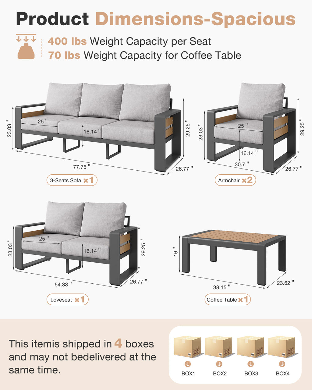 【Easy Assembly & Customer Support】Lightweight aluminum parts make setup fast with only 3–5 simple steps. Clear instructions and numbered hardware ensure a smooth process. The conversation set ships in multiple boxes, which may arrive separately. Backed by responsive customer service, ready to assist whenever needed.