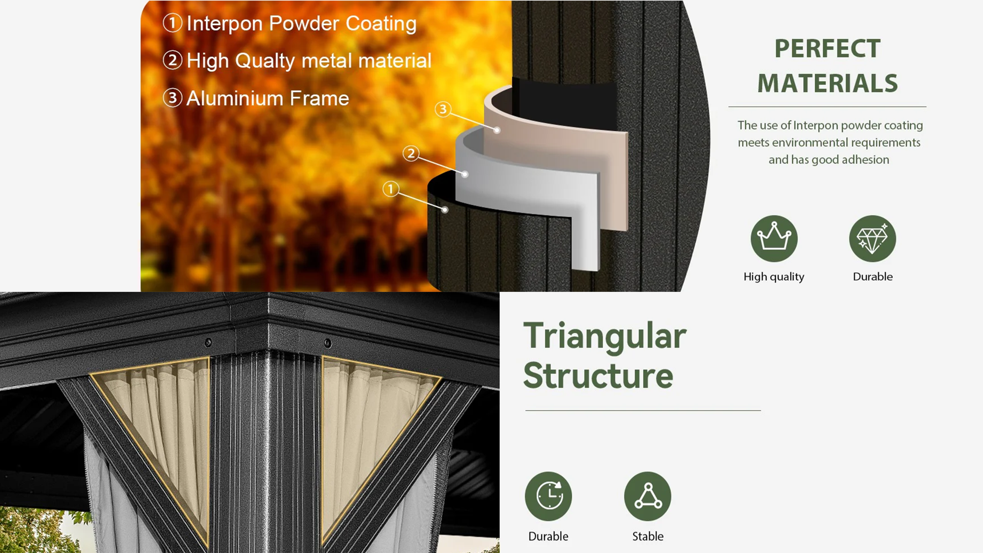 The powder-coated galvanized steel top ensures durability against rust and corrosion, providing maintenance-free use for 10 years. Featuring a triangular structure for added stability. The sturdy aluminum frame (4.7" L x 4.7" W) has a powder-coated finish using Interpon AkzoNobel, which is more environmentally friendly and offers excellent adhesion, while also resisting scratches and peeling.