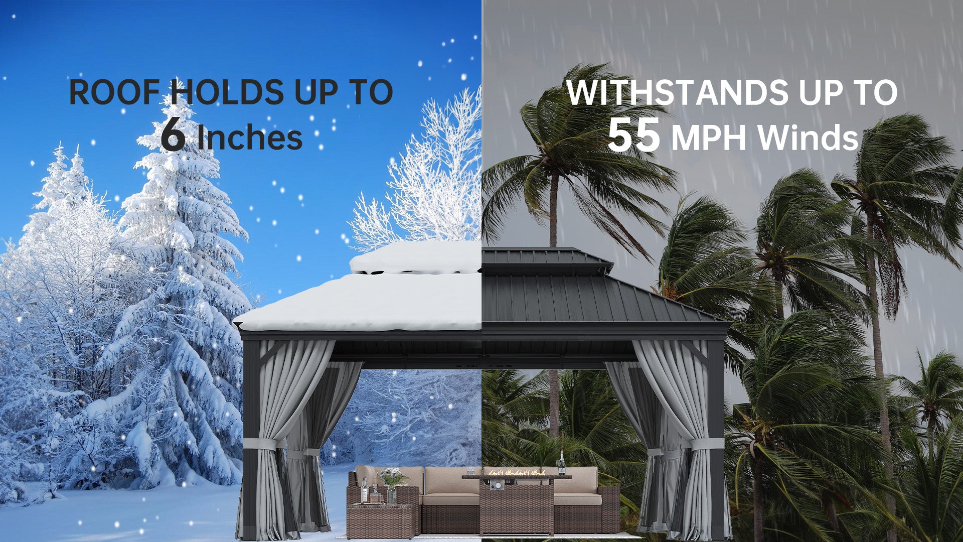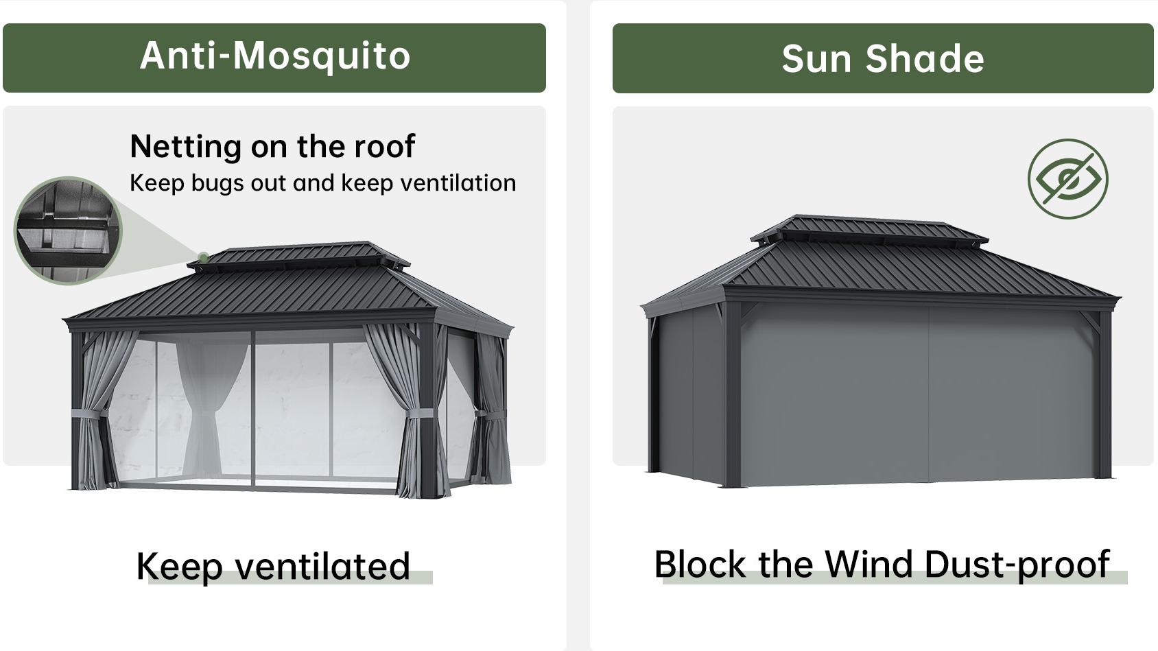 The thick powder-coated aluminum frame has strong load-bearing capacity, more wind resistance, and can protect you from the influence of sunlight and bad weather in all seasons. At the same time, 4 ground piles and expansion screws add extra durability and safety to our aluminum pavilion. Note:Maximum Wind resistant grade:7(31-38mph)