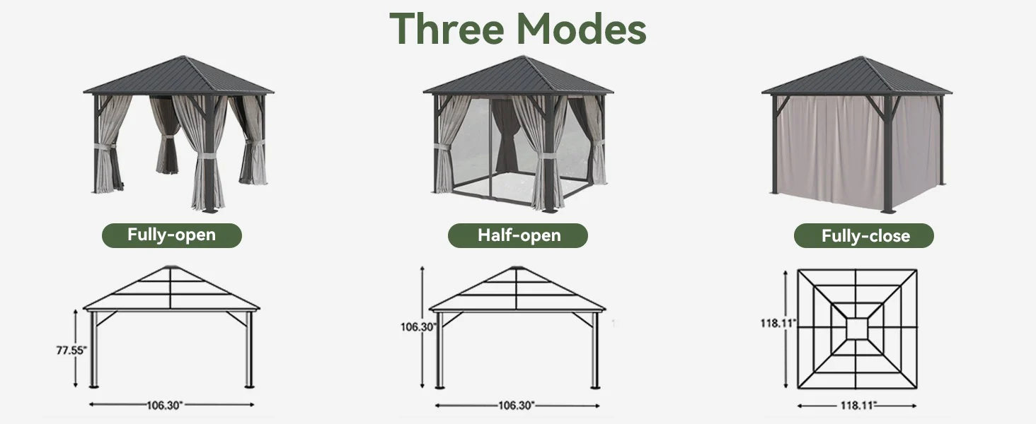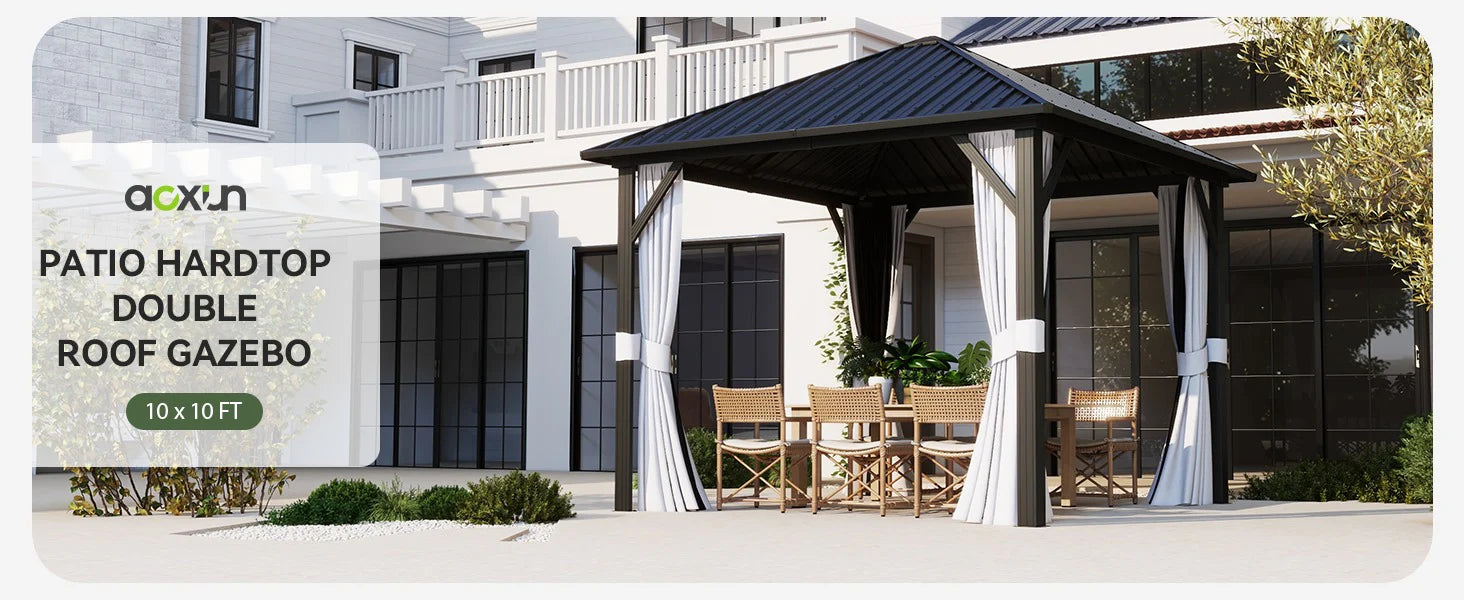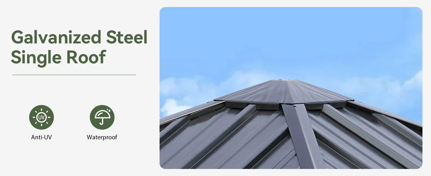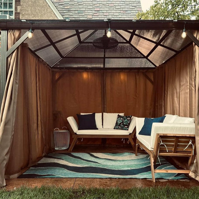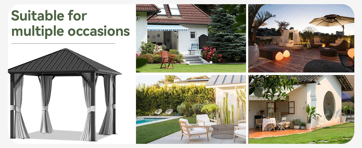 The robustness of polycarbonate makes the outdoor gazebo ideal for a long-lasting and sturdy roof that can withstand various environmental factors. It can provide adequate protection against the sun's damaging effects and allow natural light to filter through its surface, creating a bright and welcoming ambiance in the gazebo.