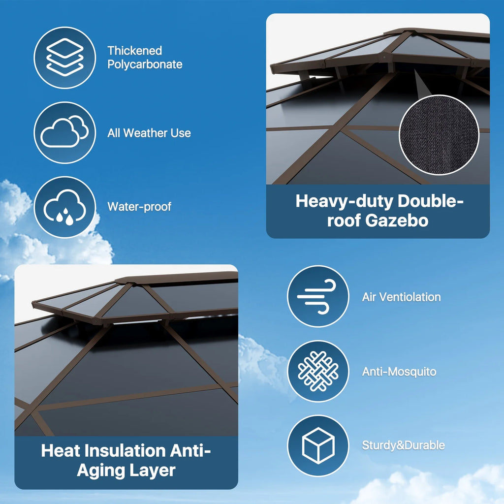 - 【VENTILATED DOUBLE-LAYER ROOF】 Our patio gazebo features a dual-layer polycarbonate roof designed for superior UV protection and enhanced airflow. The innovative design not only improves wind resistance but also allows you to enjoy sunbathing underneath without the risk of sunburn.