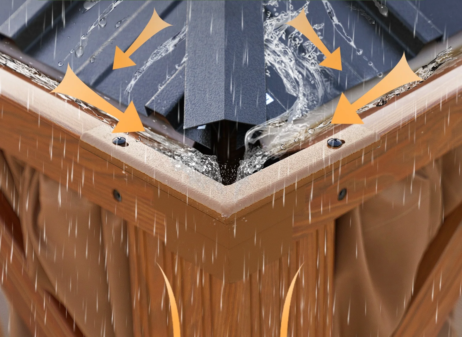 The wood looking gazebo is produced in sturdy aluminum frames with more environmentally friendly, high performance, high weather resistance powder coat finish that is not easy to scratch, peel, corrode, or rust. The technique of thermal transfer printing makes the aluminum frames look like natural wood, improving the overall appeal greatly. Triangular structure improves the overall stability and expansion screws are provided.