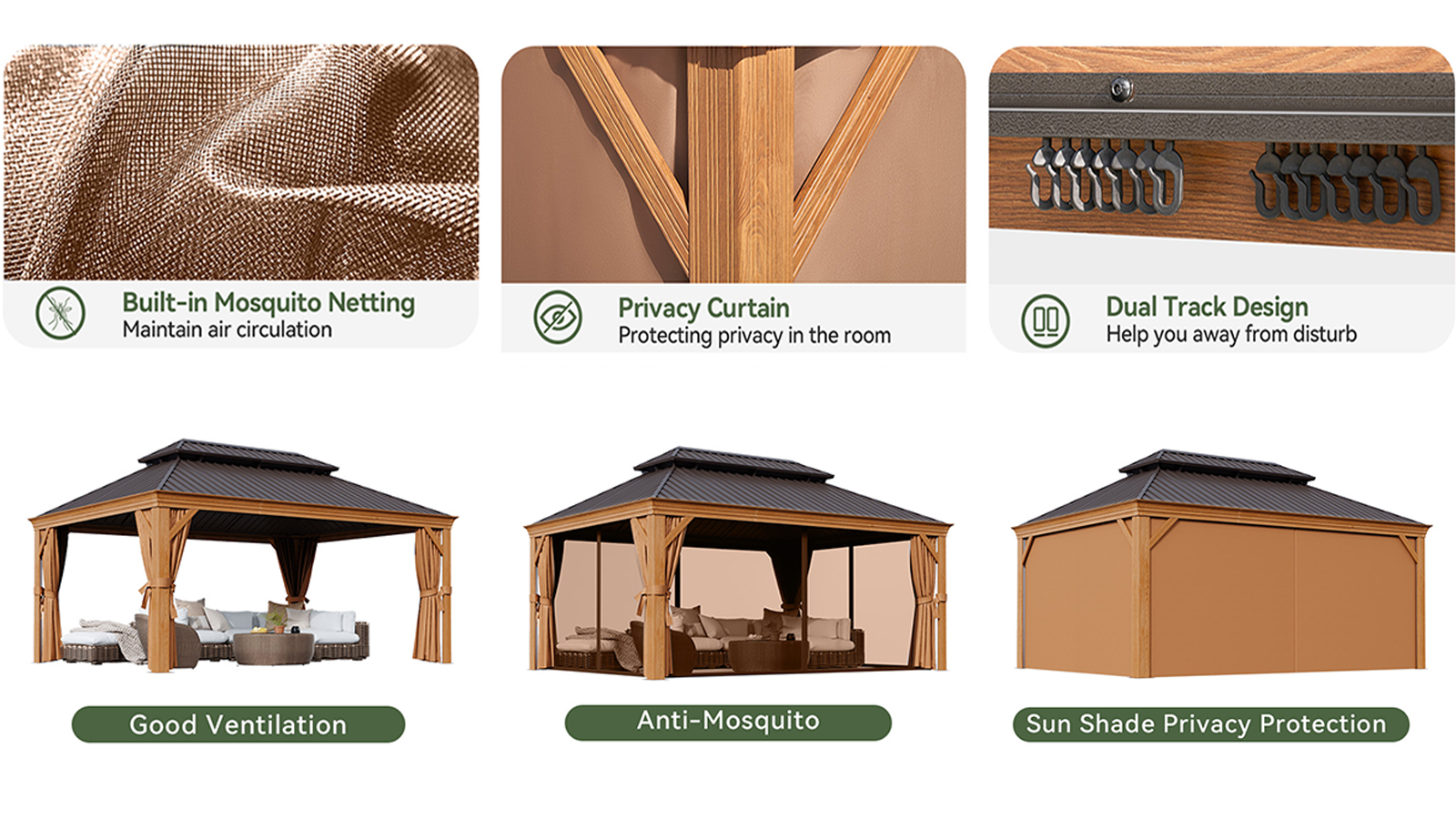 This wood like gazebo is equipped with insect net that has the ability to keep out unwanted pests such as mosquitoes, flies, and other insects, allowing you to enjoy the outdoors without worrying about bites or annoying buzzing. Besides, the 180g polyester curtains can provide privacy and keep the aluminum frame gazebo warm in cold occasions. The netting is useful as it can not only offers the open view but prevents mosquitoes from flying in especially during summers.